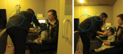 In the situations observed, the participant's trunk was flexed with the neck extended during insertion of the ear probes and use of the laptop. Sometimes she squatted to view the laptop screen. Lights above and in front of the laptop screen were a source of reflected glare. When toys used to distract the child fell on the floor, the audiologist retrieved them. She bent over to retrieve the garbage can to dispose of the ear probes. As the parents left, the audiologist also bent over to tidy up the toys. See Figure 4.